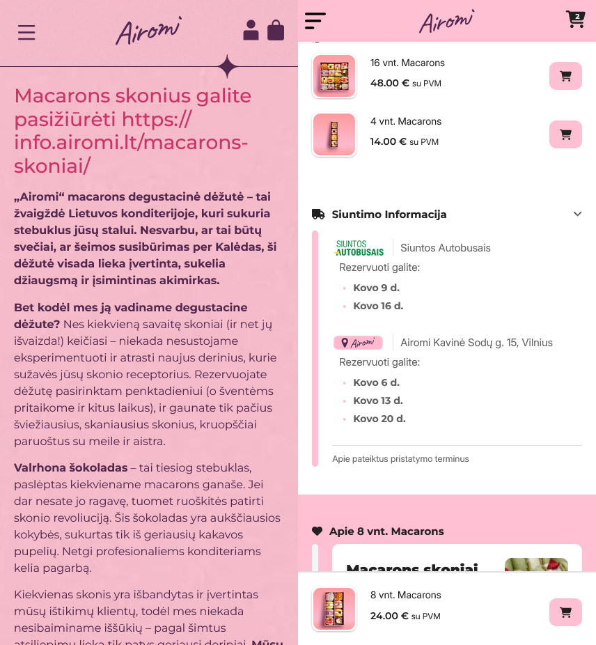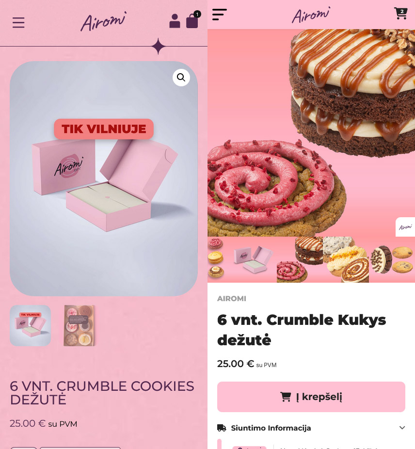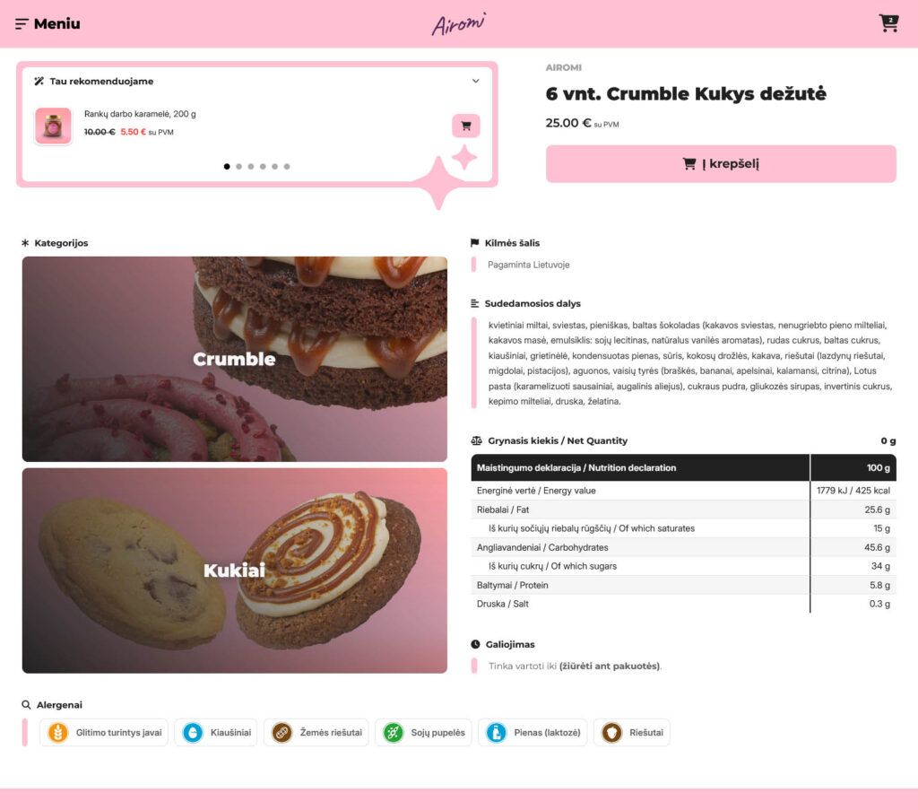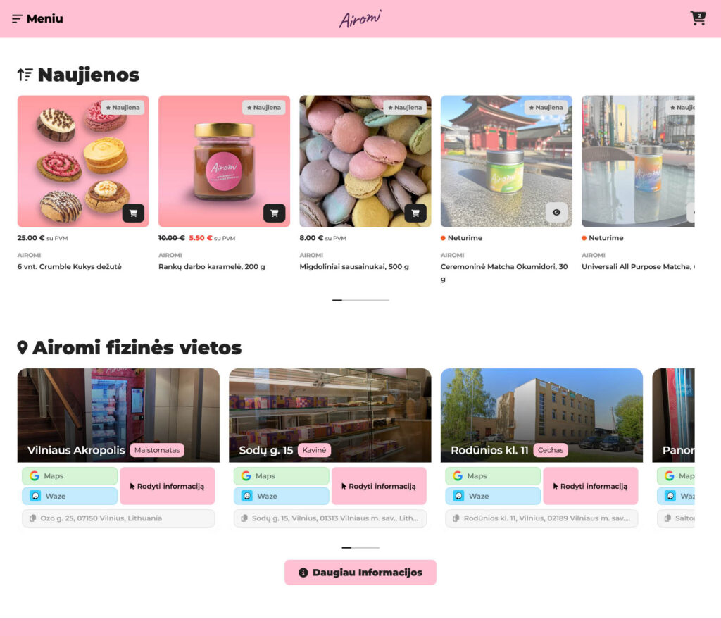 Nuo šiol navigacija tapo gerokai paprastesnė: visas svarbiausias kategorijas, naujienas ir produktus rasite akimirksniu, be jokio ilgo klaidžiojimo. Atsisakėme varginančių teksto blokų ir juos pakeitėme didelėmis, estetiškomis nuotraukomis bei aiškiomis iliustracijomis, kad desertų sudėtį ar pristatymo informaciją matytumėte iškart, o nauja paieškos sistema padės rasti norimą produktą per kelias sekundes. Jūsų krepšelis dabar visada pasiekiamas vienu paspaudimu, jame aiškiai matysite progresą iki nemokamo siuntimo, o pats atsiskaitymo procesas tapo maksimaliai trumpas ir kuo mažiau varginantis. Atsiskaityme taip pat pridėjome užsakymo suvestinę prieš pat mokėjimo mygtuką, kad galėtumėte pasitikrinti ar užsakymas tikrai toks, kokio norite. Kiekviena detalė, nuo patogesnių filtrų iki alergenų ar mūsų fizinių vietų yra kiekvieno iš Jūsų užklausą, į kurią sureagavome ir patobulinome tai ką darome. Ačiū!